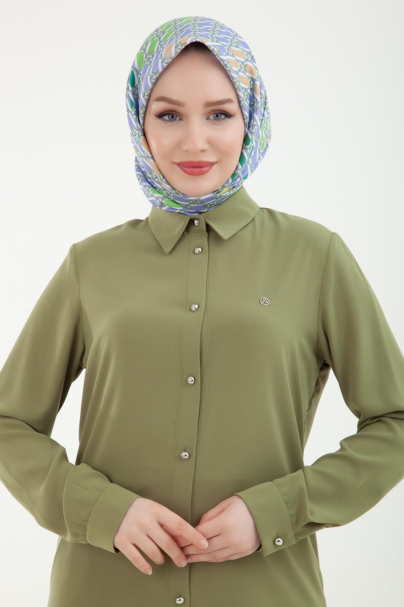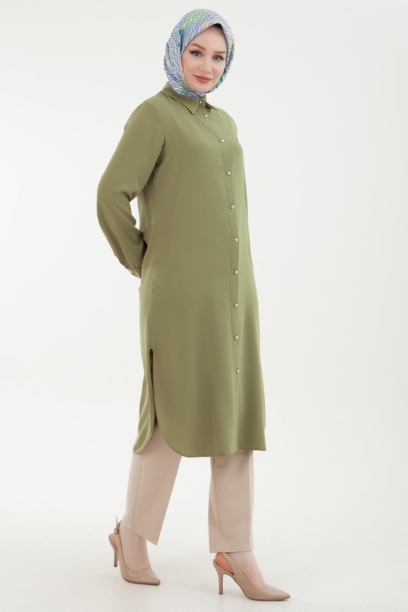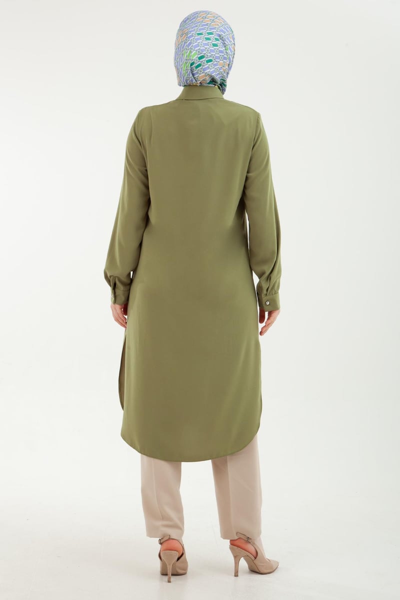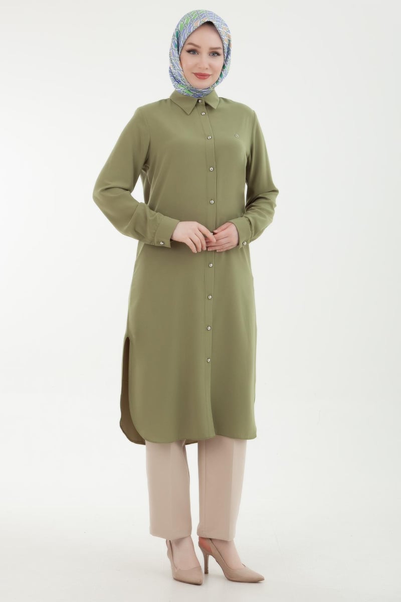 ARMİNE TREND Kolu Manşetli Düğmeli Tunik Yağ Yeşili, modern ve şık bir tarz arayan kadınların gözdesi olacak bir üründür. Zarif ve estetik tasarımıyla ön plana çıkan bu tunik, özellikle iş hayatında ve günlük yaşamda güvenle tercih edilebilir.