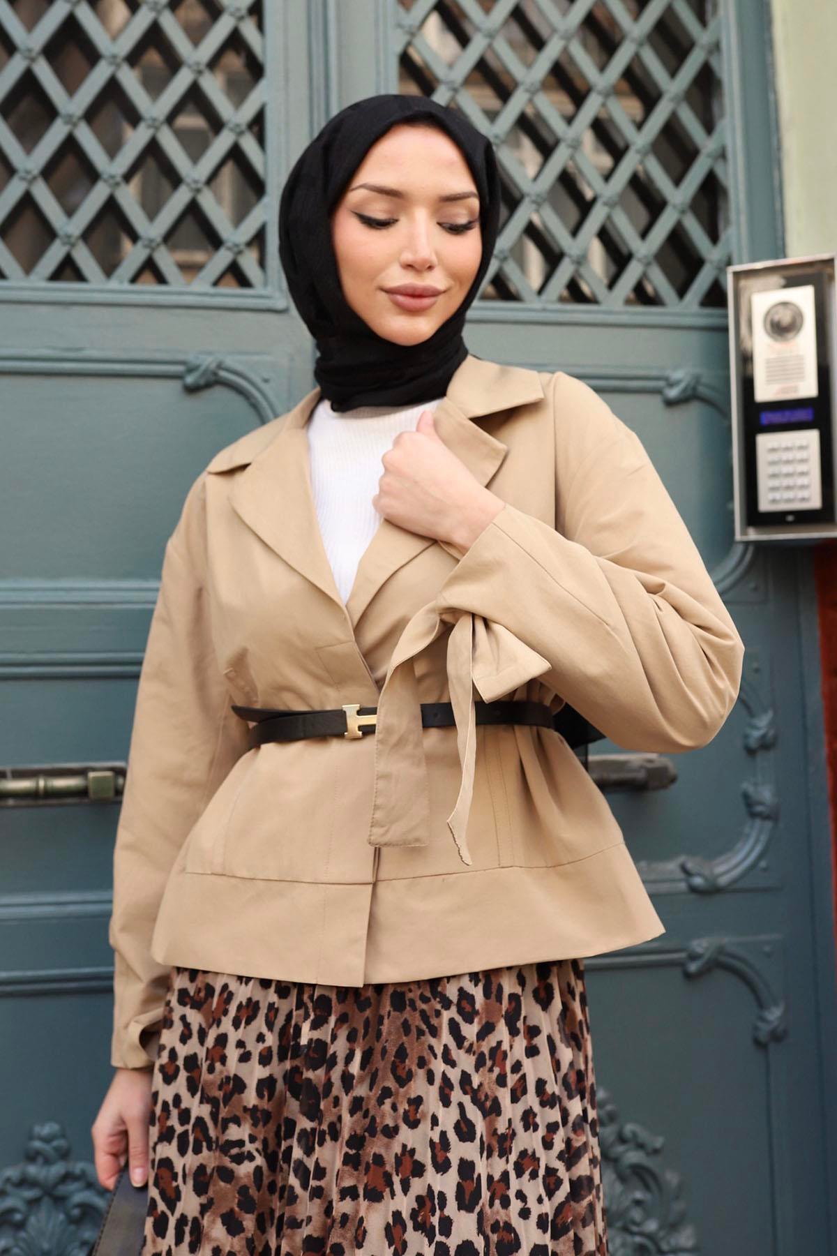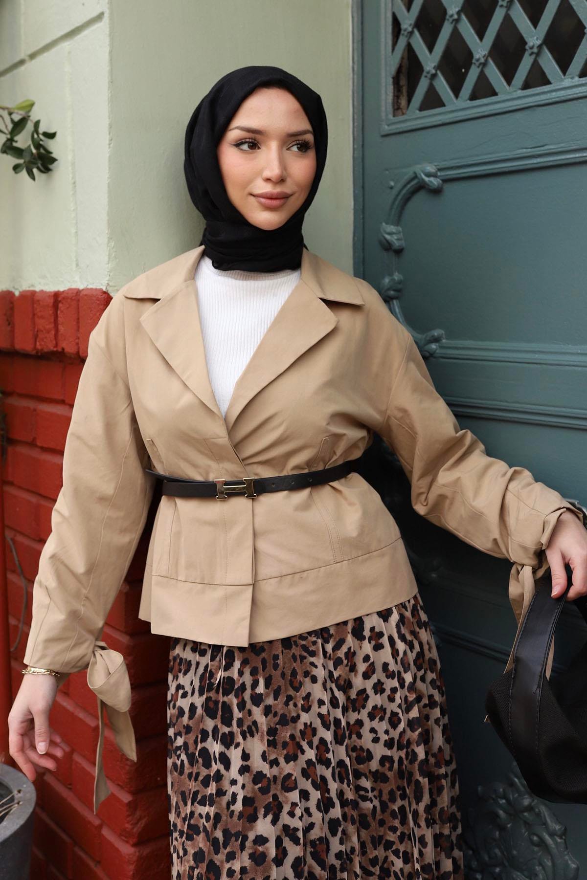 • Kesim: Kısa boyu, modern ve dinamik bir görünüm elde etmenizi sağlar; bel kısmındaki kemer detayı, daha ince bir siluet oluşturur.